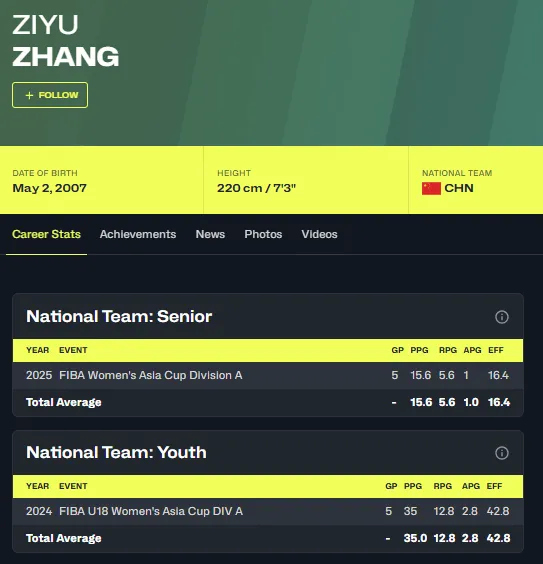 2025年亚洲杯比赛,张子宇5场比赛,场均15.6分5.6篮板1助攻。